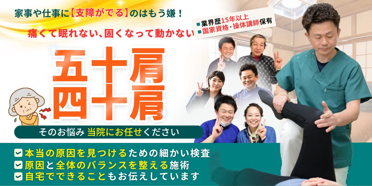 早くこの痛みから解放されたいと思う一方で、どこに頼れば効率的に改善できるのか分からず悩んでいる方は、ぜひ当院へご相談ください。丁寧な問診と多角的なアプローチで、あなたの「つらい肩」をサポートいたします。
